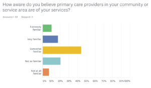 Of current respondents, 44% believe that primary care providers in their communities are aware of their services. A little over 10% said extremely familiar, and a little over 7% said “not at all.”