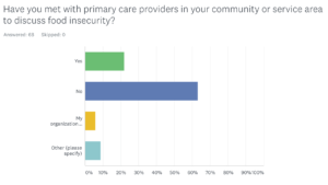 It’s another mixed bag when we ask about collaboration. Over 63% stated that they had never met with primary care providers in their community to discuss food insecurity. That’s